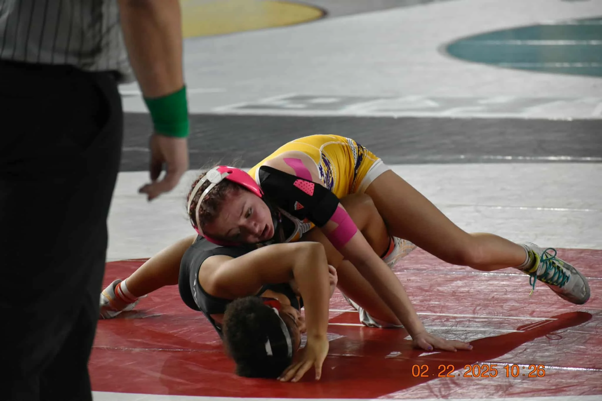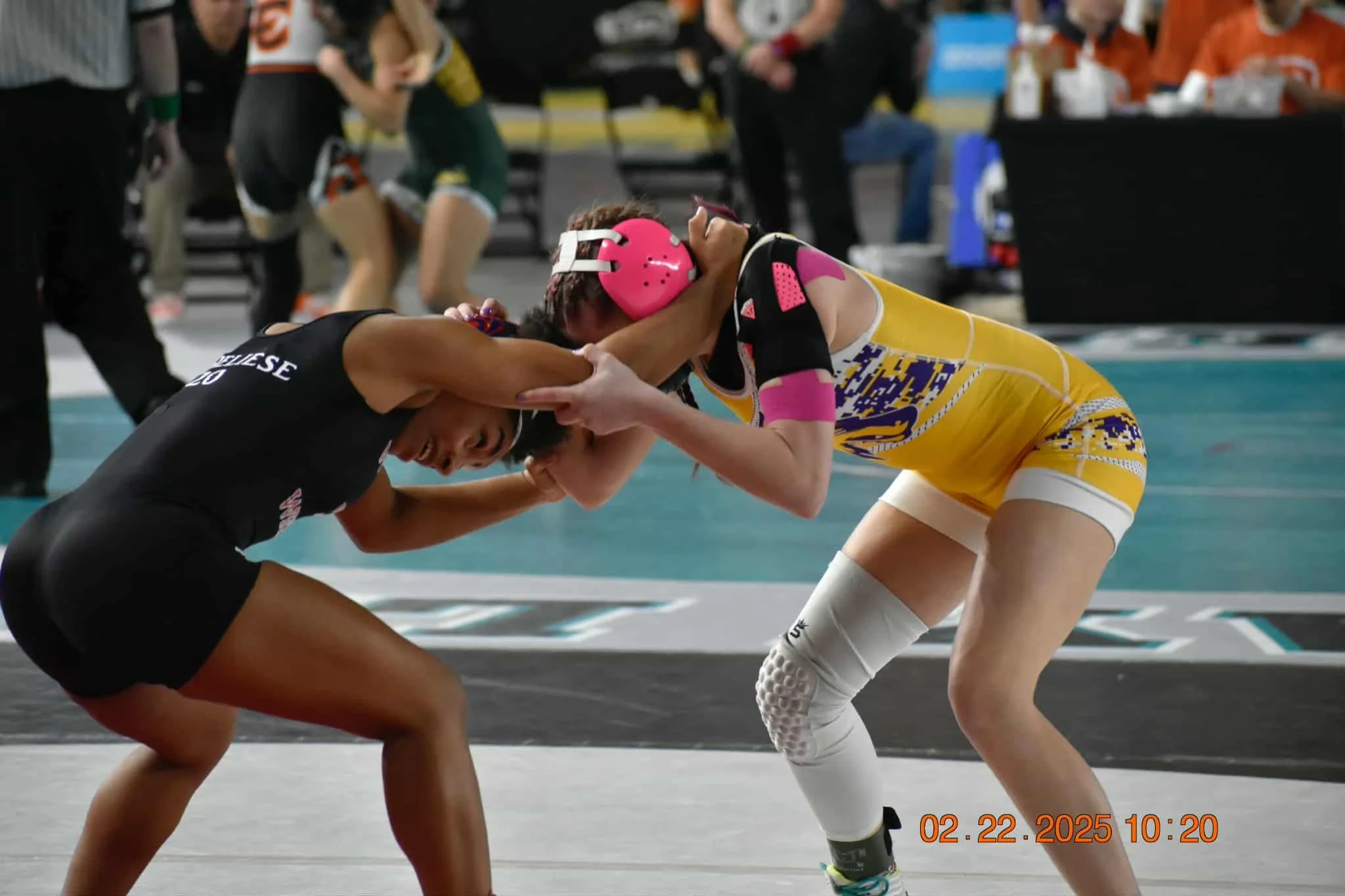 Two female wrestlers grapple, one with a black singlet and the other with a yellow and black singlet, on a wrestling mat during a match.