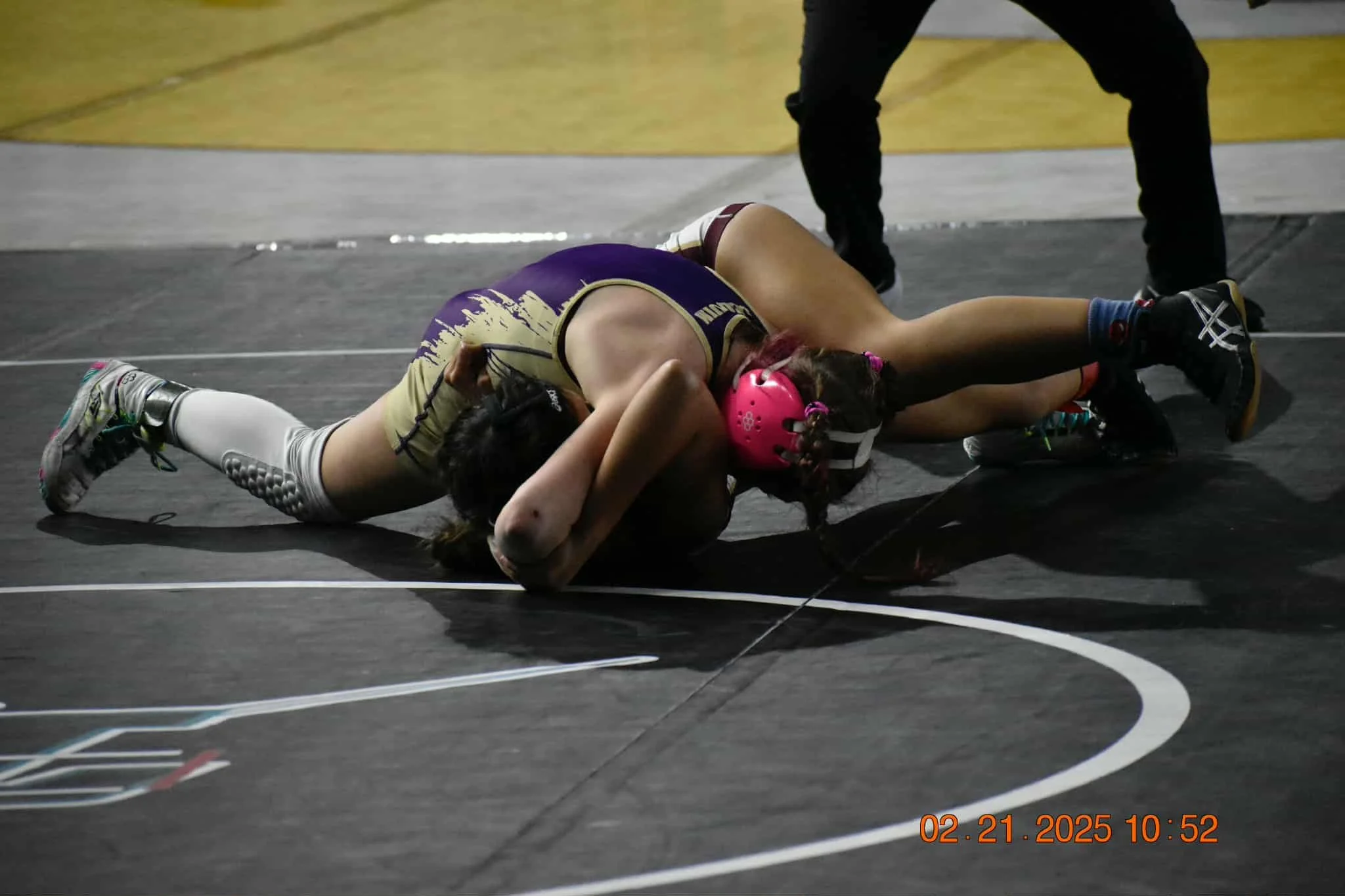 Two female wrestlers on the mat, one in a purple and gold singlet and the other in white shorts and a black and white striped shirt, one lying on top of the other during a match.